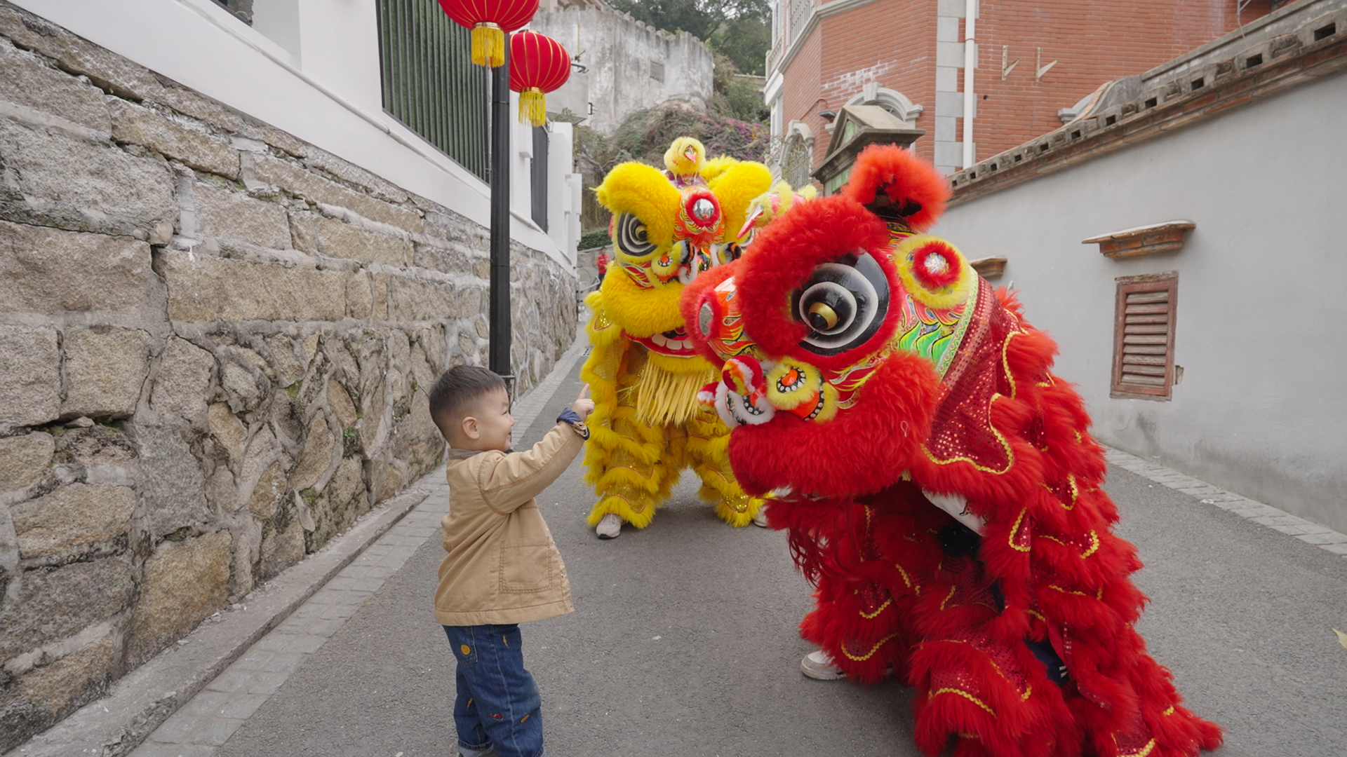 鼓浪嶼社區(qū)里,小朋友和舞獅隊(duì)員互動(dòng)